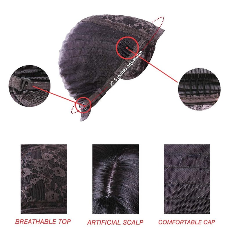 - 【Adjustable Cap】: Circumference of the middle size cap is 22.5”.In order to make the wigs more stable on head ,the cap size can be adjusted freely with 2 adjustable straps and 3 combs