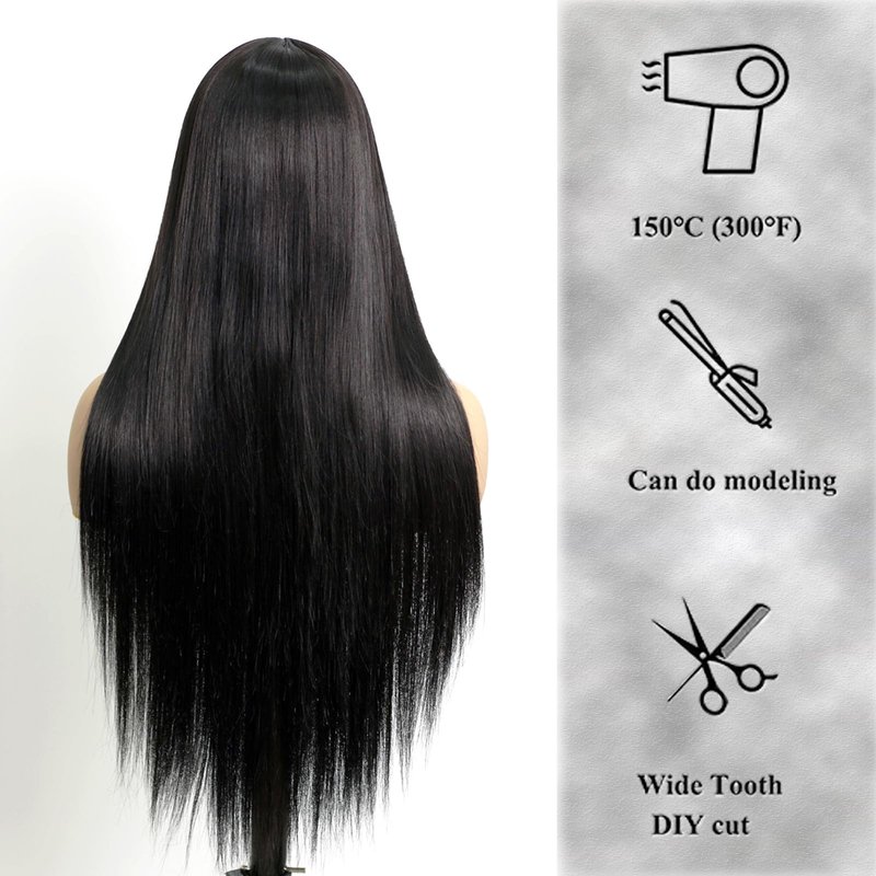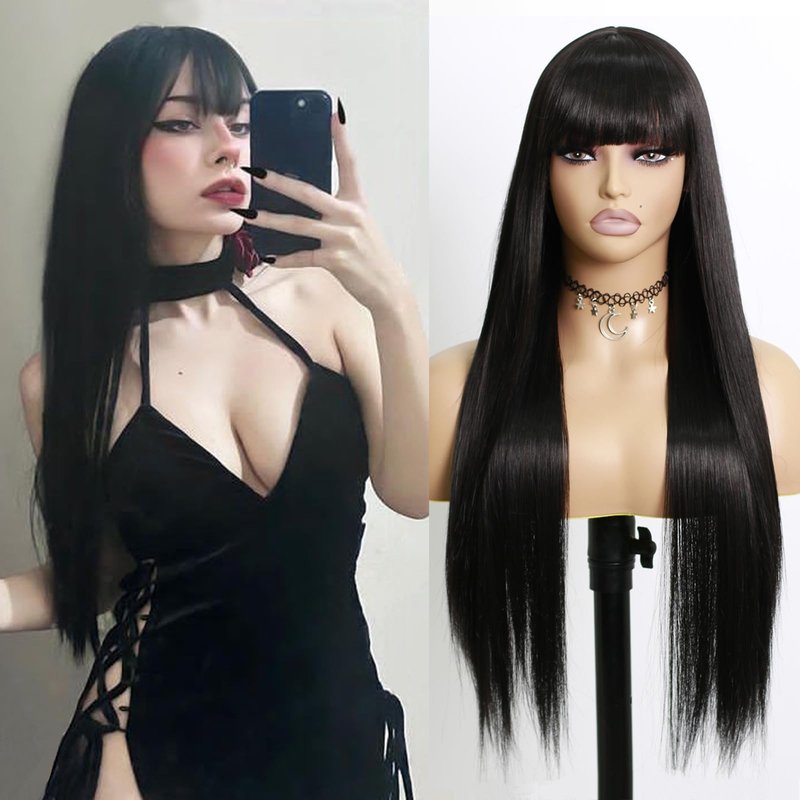 EVLYNN Black Wigs With Bangs Straight for Fashion Women 26 Inch Ombre Color Wig Heat Resistant Synthetic Fiber Hair Long Glueless Wig For Women