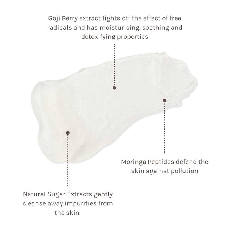 A delicately foaming facial wash to detoxify and rebalance normal to combination skin. Natural sugars cleanse away impurities and organic aloe vera softens, leaving skin clean, smooth and supple. Natural Goji Berry extract and Moringa Peptides defend against pollution. Fragranced with fresh natural aloe vera fragrance.