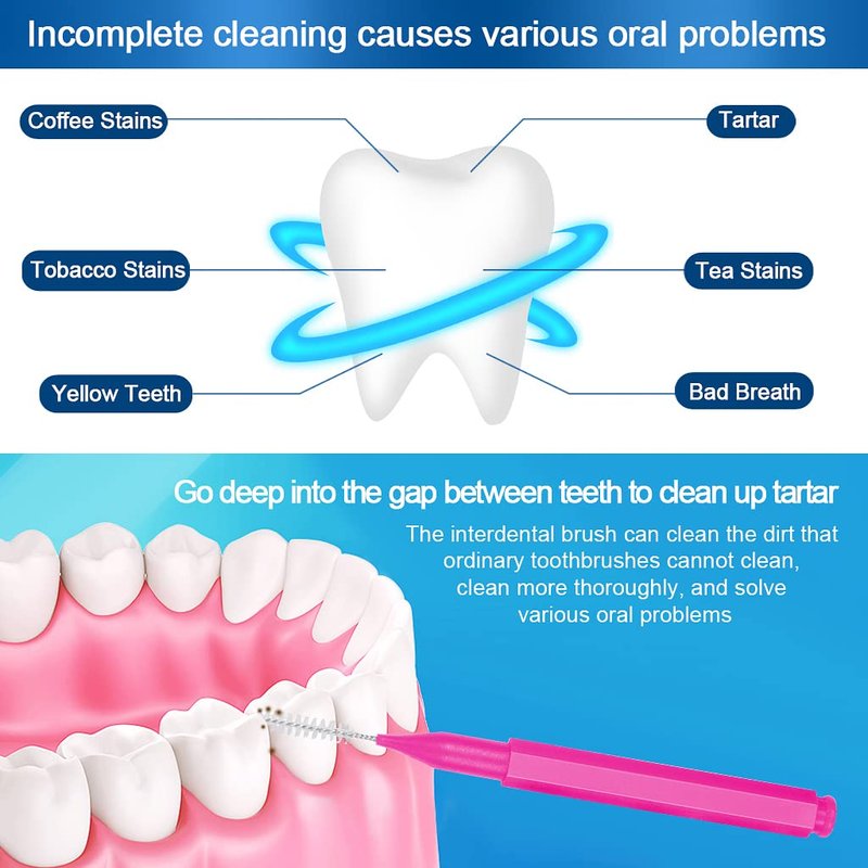 - MULTIPLE USES:Ideal for cleaning debris and residue between tooth gap,braces,crowns,bridges and implants. Also great for back teeth and crowded teeth.These interdental brush helps to maintain healthy and white teeth,prevents bad breath and have prevention of tooth decay,gum disease,tooth pattern and periodontal disease patterns.