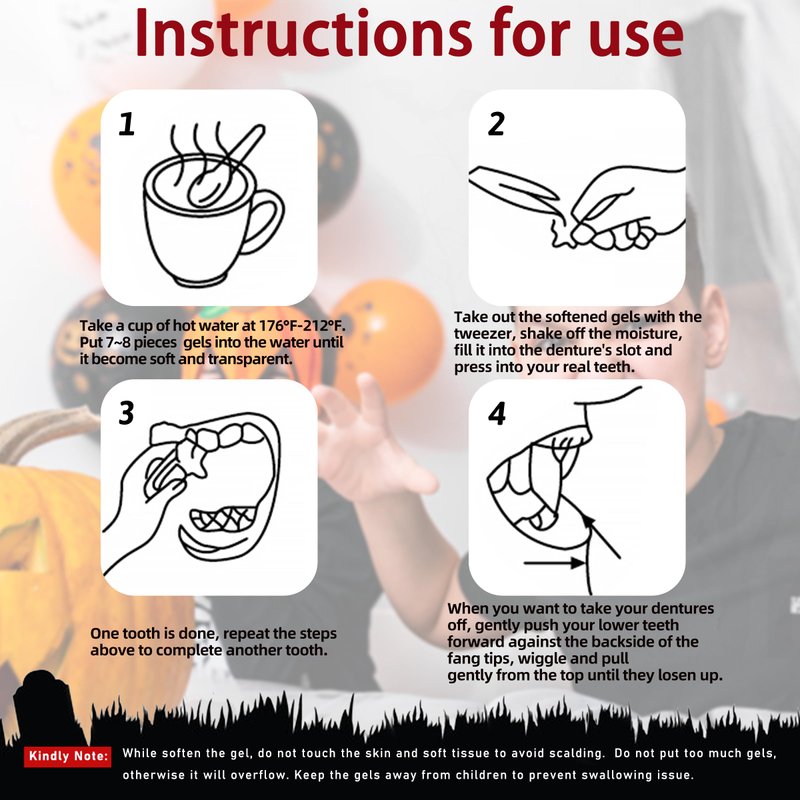 - EASY TO USE: The vampire teeth ideal for any cosplay, especially for Halloween costume party. The teeth adhesive can be quickly installed. After using the vampire fangs, gently shake the joint between the denture and their own teeth, and then pull it down. Pay attention to your strength and don't hurt yourself.