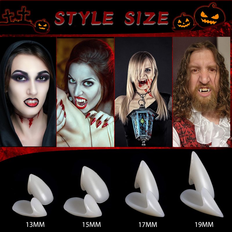 - PACKAGE INCLUDE: 4 different sizes, 13mm, 15mm, 17mm and 19mm vampire fangs teeth, 2 tube teeth adhesive, 1 small plastic tweezer.