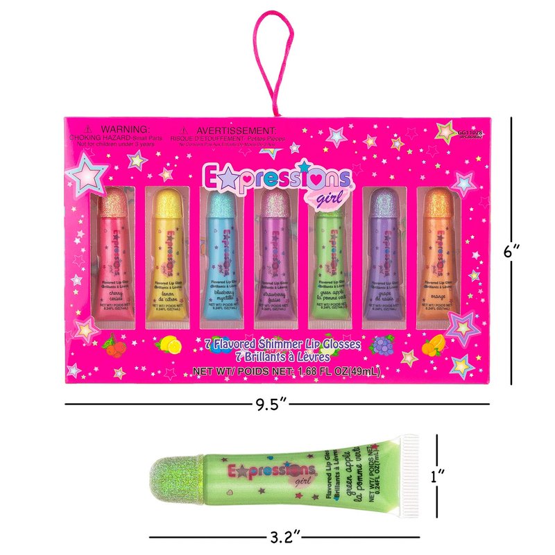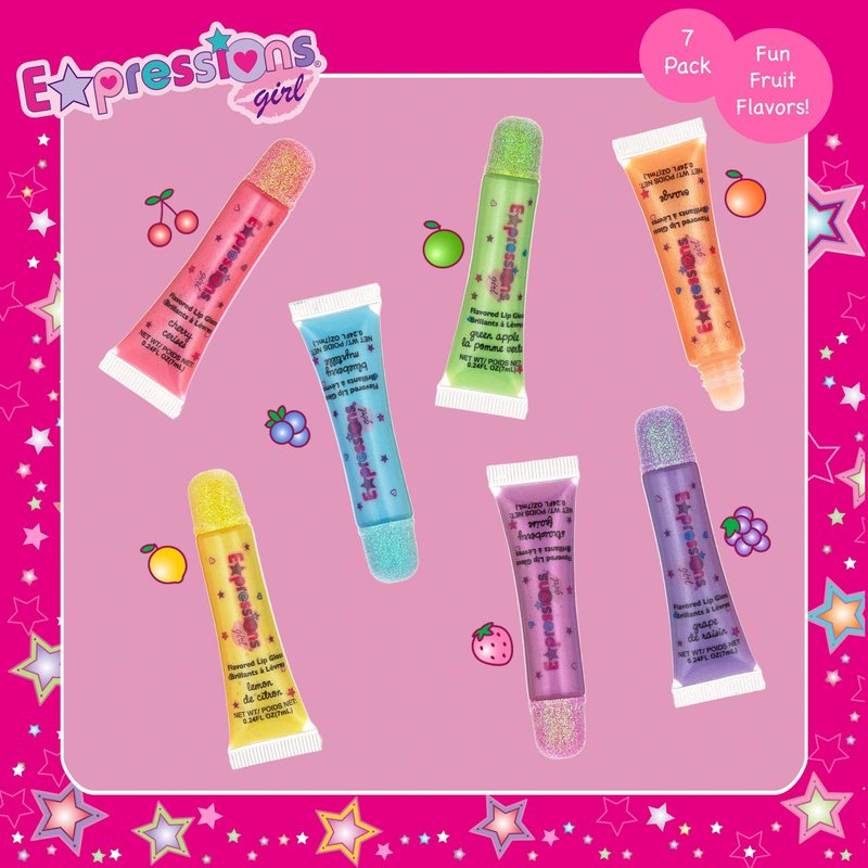 - 7 Pc Flavored Shimmer Girls Lip Gloss Set By Expressions Girl– A Gift-Ready Lip Gloss Pack Of 7 Squeeze Tube Lip Glosses In Assorted Fruity Flavors.