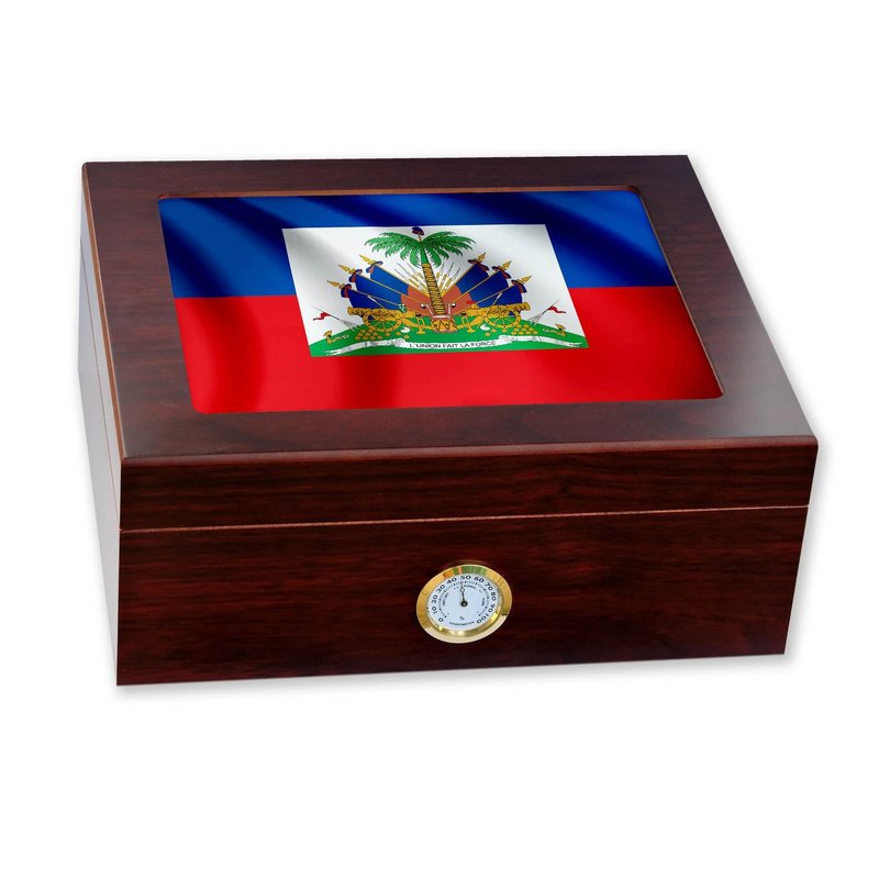 ExpressItBest Premium Desktop Humidor - Glass Top - Flag of Haiti (Haitian) - Waves Design - Cedar lined with humidifier & front mounted hygrometer.