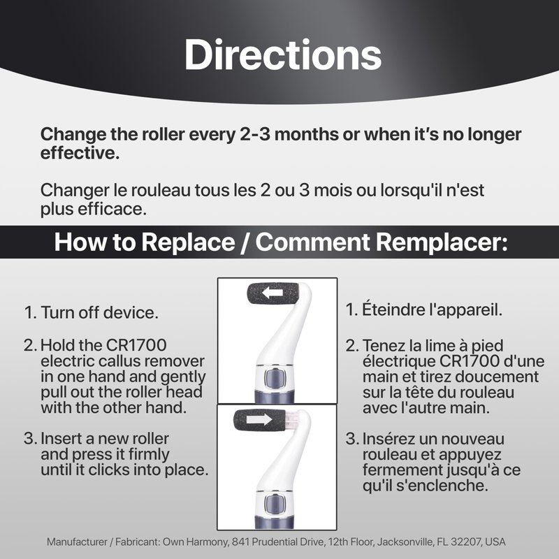 - Faster Results - IMPORTANT: Replacement heads fit ONLY Own Harmony model CR1700 foot callus remover; they do NOT fit any other models and brands. The Own Harmony refill rollers feature an innovative 3D open end design with 37% more surface area to cover even hard-to-reach spots; The 360 degree roller spins 2000 times/minute for powerful callus removal while pampering your feet.