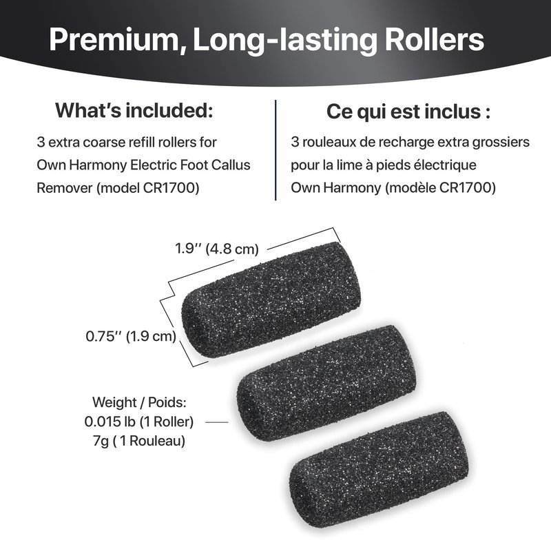 Extra coarse refill rollers for Own Harmony Model CR1700 electric foot callus remover. Long-lasting replacement heads with open end design for hard-to-reach spots. Faster results thanks to more roller surface. Long-lasting elite crystal rollers designed for long-term use. Ergonomic and easy to use. Powerful yet skin safe - pressure-adaptive roller works without interruption and stops only to protect skin. Pamper your feet in the comfort of your home with this pack of 3 extra coarse refill rollers for CR1700 foot scrubber and pedi kit.