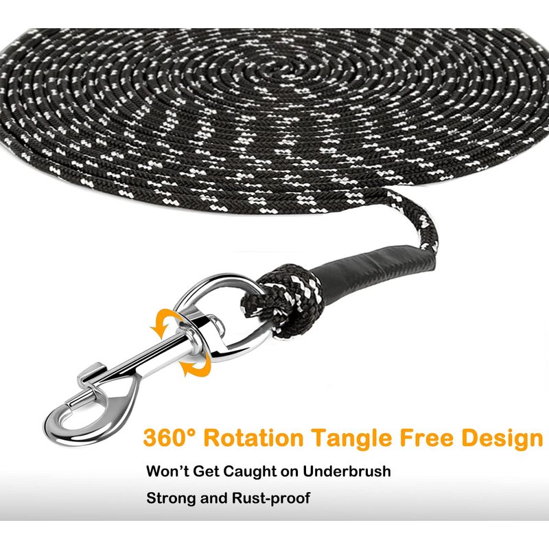 - [No Tangle Hook] - Hook is 360° rotation nickel-plated iron hook tangle free design, strong and rust-proof and won’t get caught on underbrush. Does not restrict your pet when moving from side to side without messing with the leash