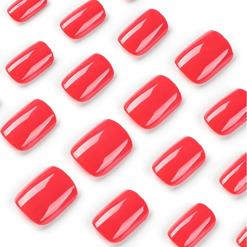 Extra Short Press on Nails Square Fake Nails with Nail Glue Red False Nails with Artificial Glossy Designs Acrylic Square Nails Full Cover Stick on Nails for Women Nail Decorations