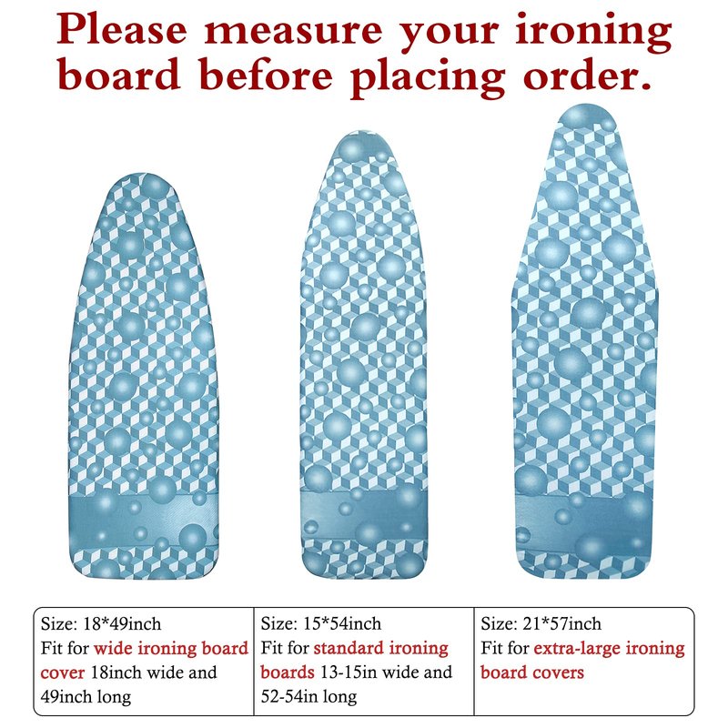 - PREMIUM FINE QUALITY MATERIAL -[READ BEFORE ORDER: Ironing board covers vary by size .Please make sure you choose correct size that matches your ironing board before placing order. ] Adopt high quality and durable 100% cotton with scorch and stain resistant finish as COVER. Comes with protective mesh cloth to avoid shining marks or scorches. More durable and heavy duty. Washing Tips: WIPE CLEAN ONLY.