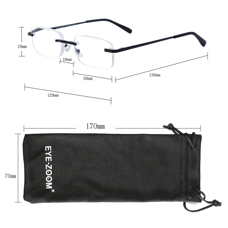 EYE ZOOM 3 pack metal rectangular-shaped rimless reading glasses with soft punch. Vintage lightweight metal no frame readers with spring-hinge, making it more comfortable to wear. Whether you are looking for a light reading glasses for outdoor and indoor. EYEZOOM classic rimless reading glasses will give you the premium protection. Strength available: +1.00 / +1.25 / +1.5 / +1.75 / +2.0 / +2.25 / +2.5 / +2.75 / +3.0 /+3.5. Color available: Black / Gunmetal/ Navy Blue / Silver.