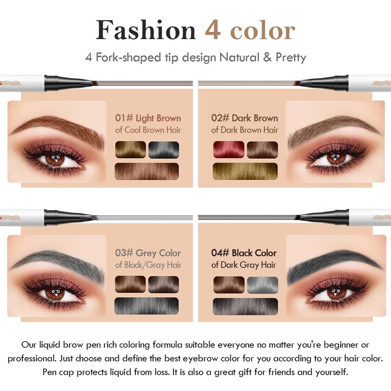 - 【Quick and Easy to Use】The 4 Micro-Fork Tip microblade eyebrow pen has a fine tip and a smooth flow of water that doesn't smudge.Just draw the outline of your eyebrows gently with eyebrow tint and continue along the shape of your eyebrows in the last step to create vivid and natural looking ,help you shape and define your brows at ease.The eye brow pencil is friendly for who needs to save time.