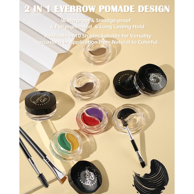 - 2 COLORS EYEBROW POMADE ALL IN 1 DESIGN - The design of combining two different colors of Eyebrow Pomade in the same jar is super convenient. With the complimentary eyebrow brushes, it is easy to create beautiful eyebrows. 6 popular colors of eyebrow pomade with clear eyebrow setting gel, which are suitable for your daily makeup. 7 bold colors of eyebrow pomade for your cosplay. Multi colors of eyebrow creams to meet all your eyebrow makeup needs.