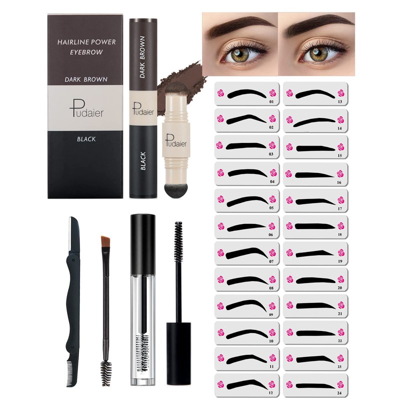 Eyebrow Stamp Stencil Kit-2 Colors One Step Brow Makeup Set with 1 Clear Eyebrow Setting Gel, 24 Brow Stencils, 1 Brush & 1 Razor, Long Lasting Waterproof Brow Makeup for women (Dark Brown & Black)