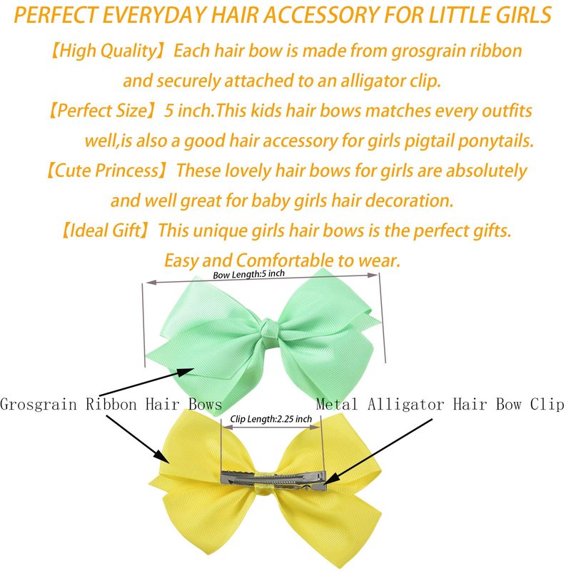 - Bows Size: Each handmade hair bow measures 5 inches across (allowing for a variance of 0.5 inch) and features a 2.25 inch lined alligator clip, crafted from 1.60 inch boutique grosgrain ribbon. Weighing just 0.5 ounces, these hair bow clip are ideal for little girls pigtails, perfect for clipping hair to the side or decorating braids and ponytails.