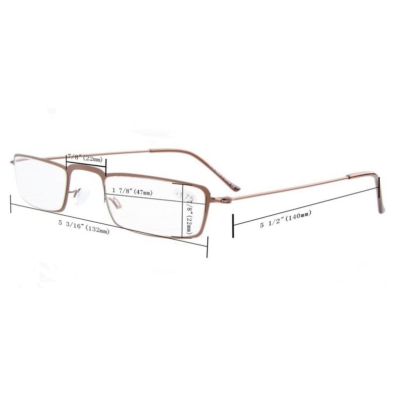 - ►[ PRODUCTS DIMENSION ] - Half-eye readers’ frame material is Stainless Steel. Lens Width ≈ 1.85 inches (47mm) Frame Width ≈ 5.24 inches (133mm) Lens Height ≈ 0.94 inches (24mm) Frame Height ≈ 1.02 inches (26mm) Bridge (DBL) ≈ 0.75 inches (19mm) Temple Length ≈ 5.51 inches (140mm) The above measurements may differ by 0-1 mm.