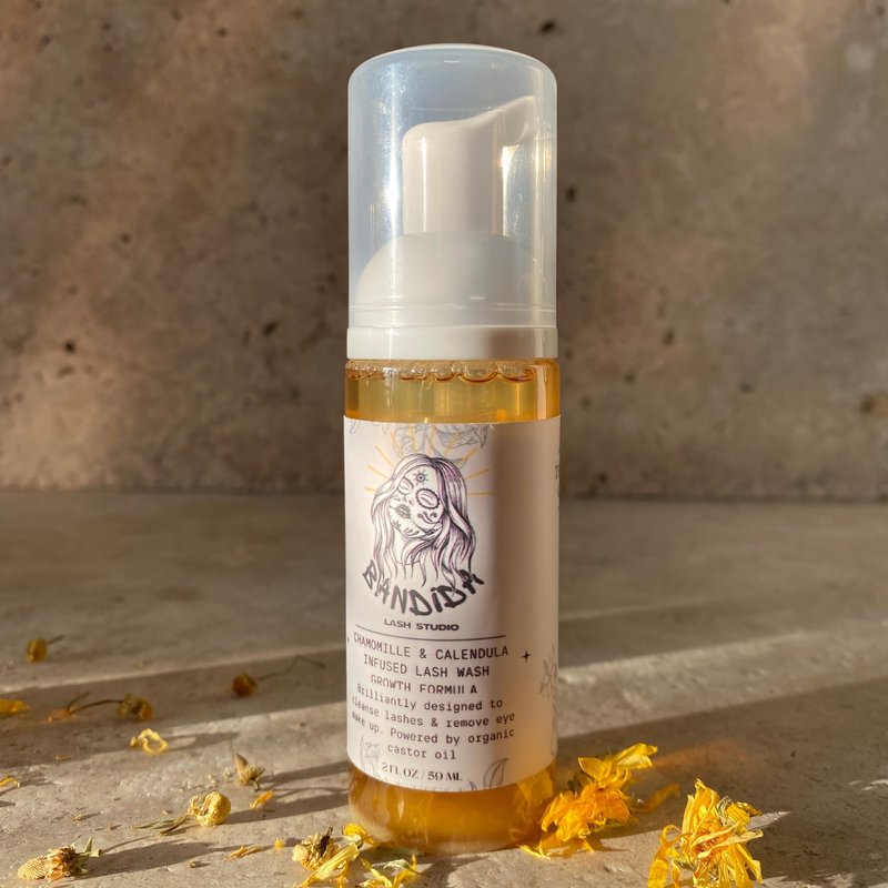 Eyelash Extension Shampoo + Brush/Foaming Lash Wash for Extensions & Natural Lashes/Safe Makeup Remover infused with Organic Chamomile & Calendula, powered by Organic Castor Oil 2oz