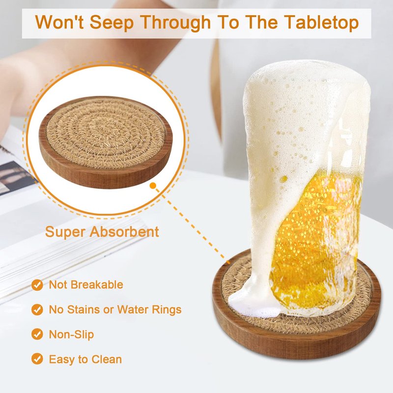 Wood Coasters for Drinks, Eykao Absorbent Coaster Sets of 5, Woven Drink Coasters for Coffee Table, Housewarming Gift for Farmhouse Home Decor, 4 inches 5 Pack Coasters for Drinks Absorbent: Wooden coaster of the inside made of cotton fabric that can absorb a larger amount of condensation and make sure moisture would not permeate on the table; keep the table dry in case that gets stains or water rings. Non-Stick Glass: The coasters wouldn't cling to the bottom of the cup when you pick up your drink; durable and sturdy, not easy to be fragile, coaster surfaces are flat and stable, and even the lightweight cups don't need to worry about water cup slides or drink overflow. Non-Slip Feet Pads: Drink coasters with 4 soft anti-slip pads on the bottom, protect your furniture from scratching, and prevent water cup slide and dink overflow, suitable for both hot and cold. Easy to Clean: Just get out the woven coasters, rinse coasters with water and hang up to dry, Diameter 4 inches; reusable round coasters come with a gift package, perfect for housewarming and kitchen gifts. Simple & Classic: Handcrafted table coasters with warm wooden tones, can be as home decor, match your end tables and other furniture perfectly, and add comfortable feeling to your coffee table, great for the kitchen, living room, bedroom, or office.