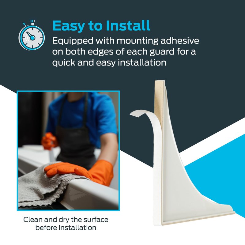 - QUALITY DESIGN: Corner shower shields feature a curved edge design and includes one left and one right-hand guard with mounting adhesive on both edges to prevent the splashing of water onto bathroom floors to keep the bathroom dry and clean
