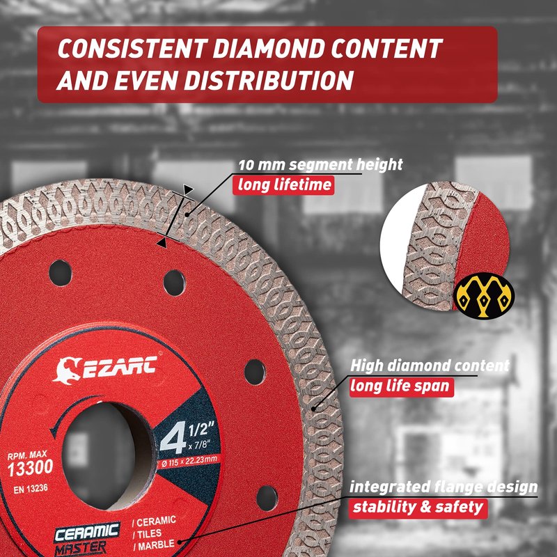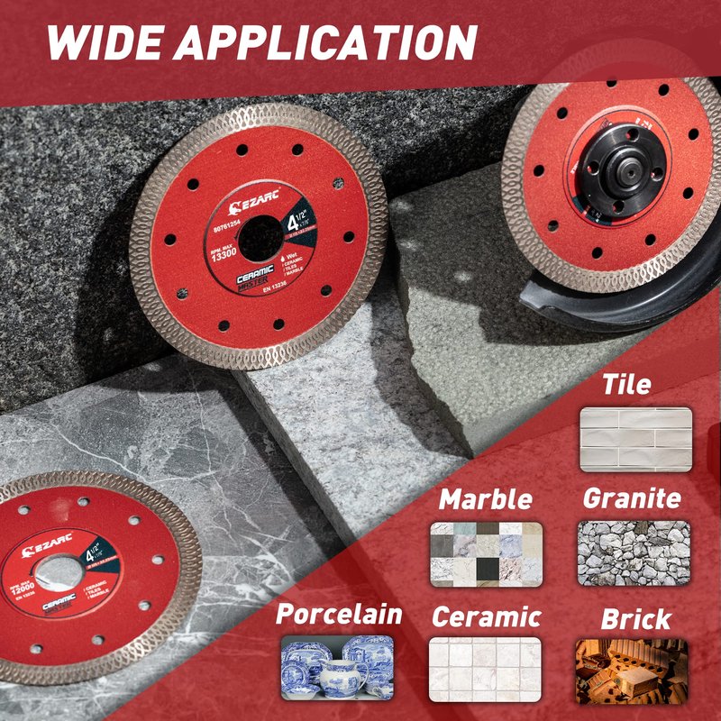 - 【Super Thin Design】EZARC Super Thin diamond saw blades are specialized cutting discs designed to deliver precise and clean cuts in a variety of tile materials, such as ceramic, porcelain. It will be a perfect partner for tile installers and general homemade DIYers.