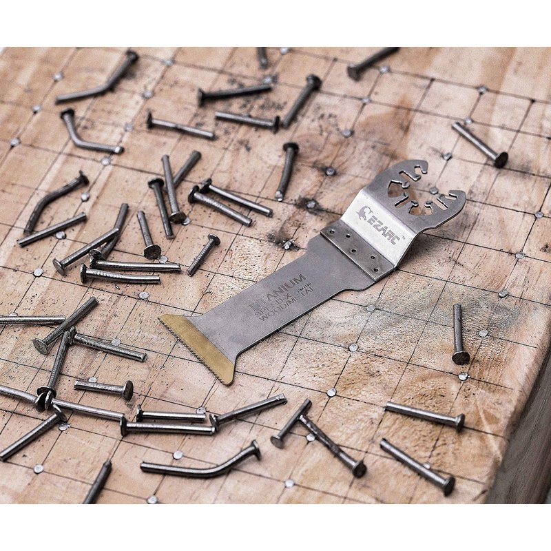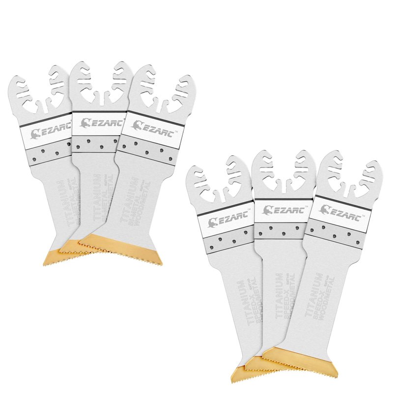 EZARC Titanium (TiN) All-Purpose Speed Cutting blades Set is specifically designed for multi-material cutting. The new titanium oscillating saw blades with extra-long length perform longer lifetime and faster cutting speed. The high-quality titanium coated tooth strip makes the saw blades especially wear-resistant in demanding heavy duty applications, e.g. for screws, nails or laminate, hard wood. The wave set teeth design reduces the strain and remove chips effectively, less burning happen for wood cutting.