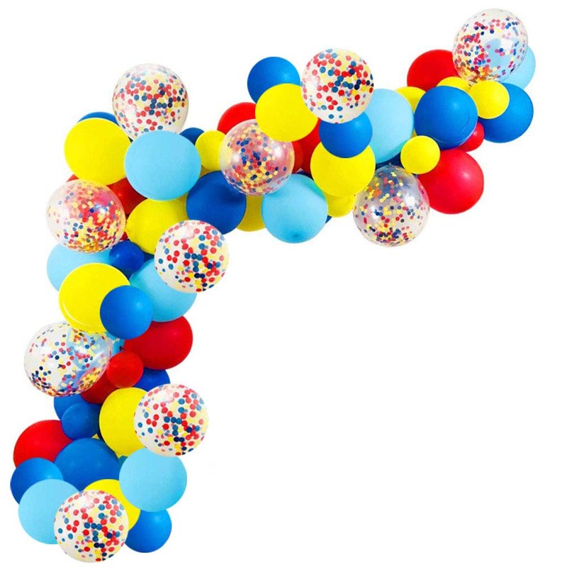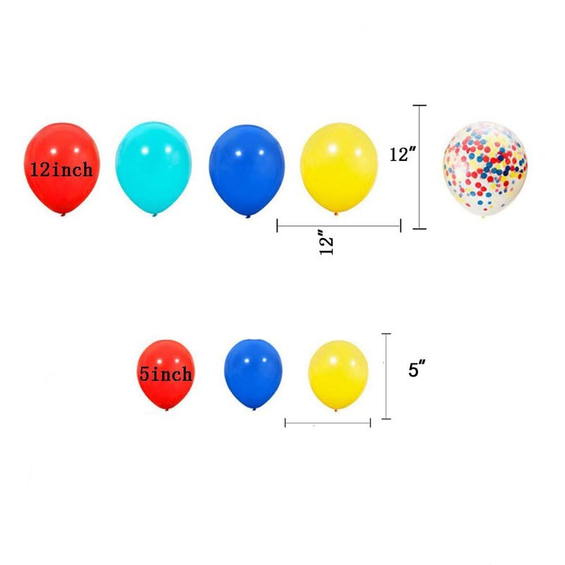 - 80pcs latex balloon contain 10pcs 12inch red ,10pcs 12inch light blue, 10pcs 12inch blue ,10pcs 12inch yellow , 10pcs 5inch red,10pcs 5inch blue ,10pcs 5inch yellow, and 10pcs 12inch confetti balloons .
