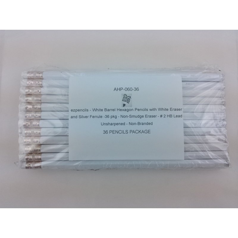 ezpencils - White Barrel Pencils with White Eraser and Silver Ferrule - 36 pkg - Non-Smudge Eraser - # 2 HB Lead - Unsharpened - Non-Branded
