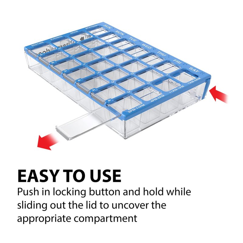 - EASY USE: Pill planner has easy fill trays that slide out so that you can fill a whole days worth of medication at once