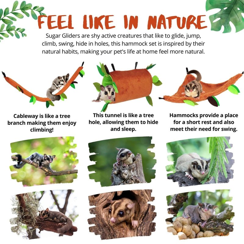 Sugar gliders are active forest animals, so cage accessories are necessary pet supplies. This hammock set is ideal for sugar gliders because it is designed to resemble their natural habitat. The circular swing will satisfy their happy to swing, and the triangular hammock will allow them to take a short break. The tunnel serves as their tree hole, allowing them to hide, sleep well, and adapt to their new surroundings. The cableway is similar to a branch that can meet their crawling needs. pleasure. All animals require accessories to keep them entertained in their cages, especially when they are left alone for long periods of time. Proper cage accessories are critical for both mental and physical health. This small animal hammock set is also great for other pets like Guinea Pigs, Chinchillas, Sugar Gliders, Hedgehogs, Gerbils, Marmosets and many more.