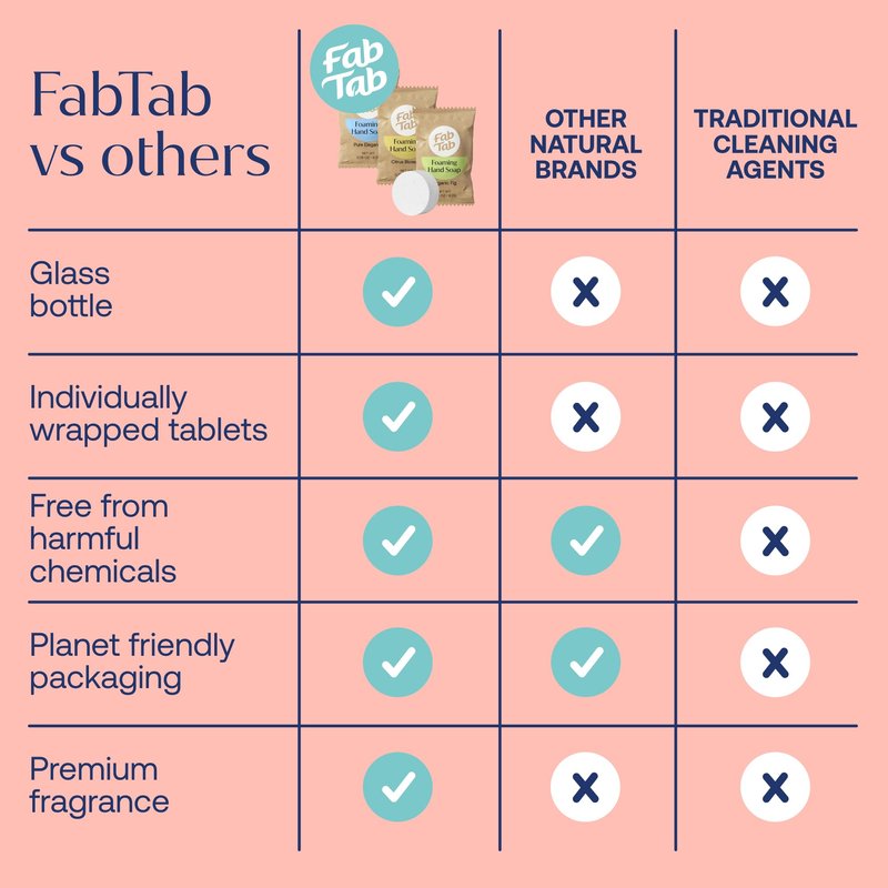 Give dirt a one-two punch with our home cleaning and hand washing tablets. Crafted from gentle ingredients, the FabTab cleaning tablets obliterate the need for harsh chemicals. By welcoming FabTab into your cleaning routine, you're not just tidying up – you're joining a tribe of eco-conscious warriors and championing a better world where pristine spaces and responsible choices unite seamlessly. Our FabTab cleaning tablets provide you with a quick and affordable solution for all your cleaning needs. We designed these plastic free cleaning tablets to dissolve in water to create a cleaning solution in a matter of minutes. Drop one of our spectacular foaming hand soap tablets into your glass bottle already filled with warm water, watch it dissolve entirely, and voilà – your hands are in for a dance party