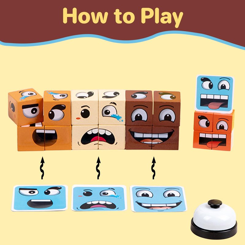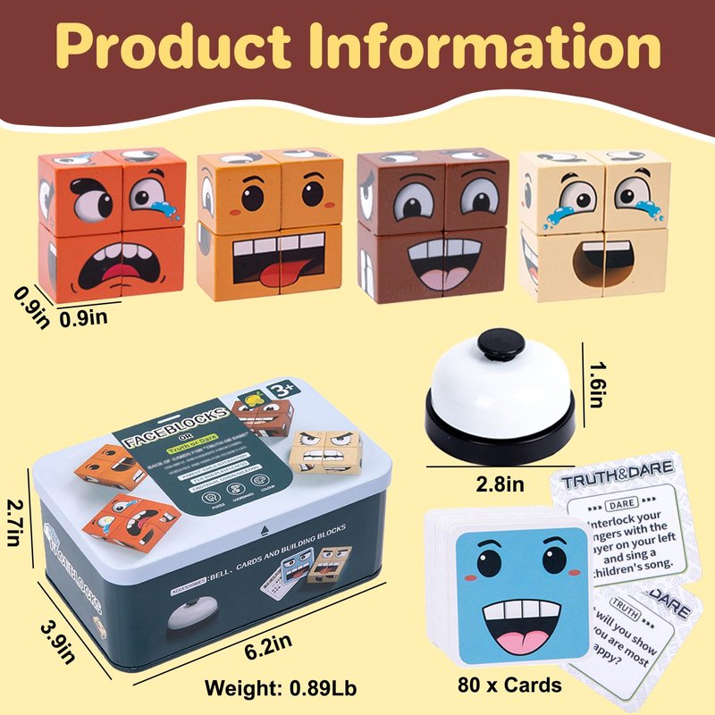 - 【Face blocks Game with Bell】The face changing magic cube is suitable for all children older than three years. and is a great interactive game toy. Kids take one card and build the blocks according to the reference. The one takes the shortest time wins