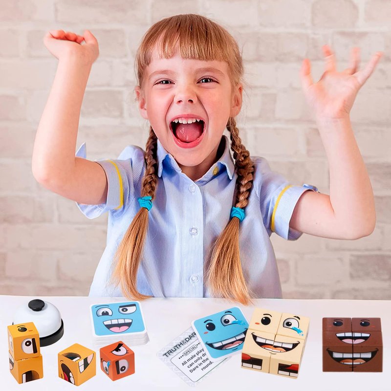 - 【Christmas Gift for kids & adults】The face changing magic cube game is suitable for kids & adults! It's a great interactive game toy. Kids take one card and build the blocks according to the reference. The one takes the shortest time wins. For adults, it‘s perfect for parties and gatherings, we prepared ’truth or dare‘ game for you (printed on the back of the card), if you are looking for games for xmas party, this is an option!