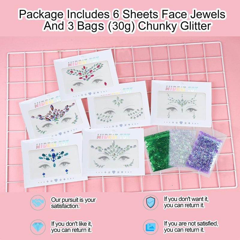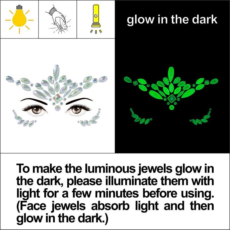- Great Glitter - 3 sets colored face jewels and 3 sets body gems glow in the dark and 3 different body glitters to add sparkle. They come in individual packaging. The face glitter comes in resealable pouches and is highly pigmented. The glitters are made of multiple sizes and a rainbows of holographic imprints that make them extra sparkly, easy to use with body glue or lash glue, you can apply as accents on your face, hair and body. Chunky glitter is easier to work with and clean up as well
