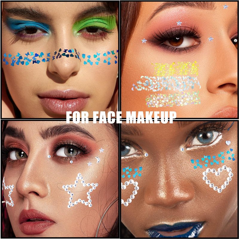 - FESTIVAL MAKEUP GLITTER RHINESTONE STICKERS:The makeup glitter and hair gems are commonly used on the face, cheeks, eyebrows, lips, hair, collarbone, hands,etc. for enhancing various makeup looks or festival hairstyles for specific events such as parties, festivals, concerts,weddings, proms, Halloween.