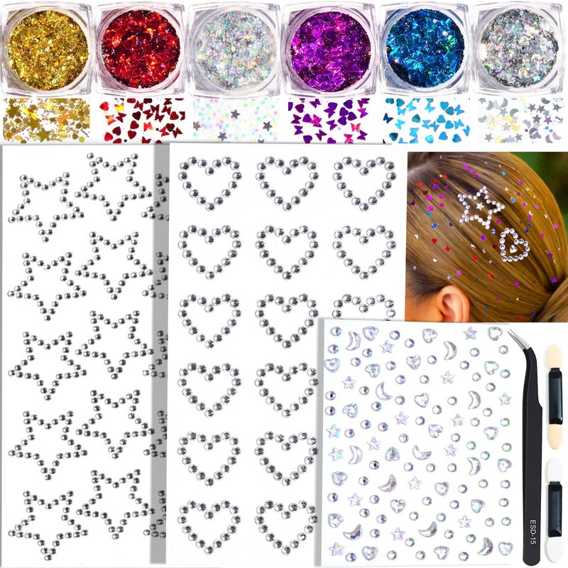 - FACE GLIITTER AND FACE RHINSTONES STICKERS: You will get 3 sheets face rhinestones stickers in lovely shiny heart and star shapes, 6 colors chunky face glitter gel with heart and star shapes, 1 pick-up tweezers and 2 mini sponge applicator; Sparkly chunky makeup glitter and stick on gems stickers to meet your festival use and decoration demands.