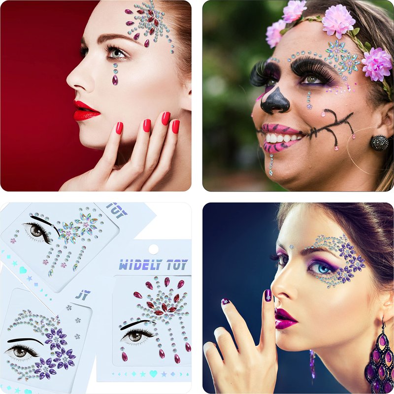 - More Colored Jewels-great face decorating set, 6 sets of gemstone stickers and 1 bag AB purple chunky glitter. Attractive self-adhesive gemstones presented in lovely facial patterns, a nice supply of body glitter, stunning design, and hypoallergenic material, stick well and stay on. You can wear them on your eyes, face, body, or DIY handmade decorations. You can cut them if you want to use just a part. You can reuse them by returning to their plastic.