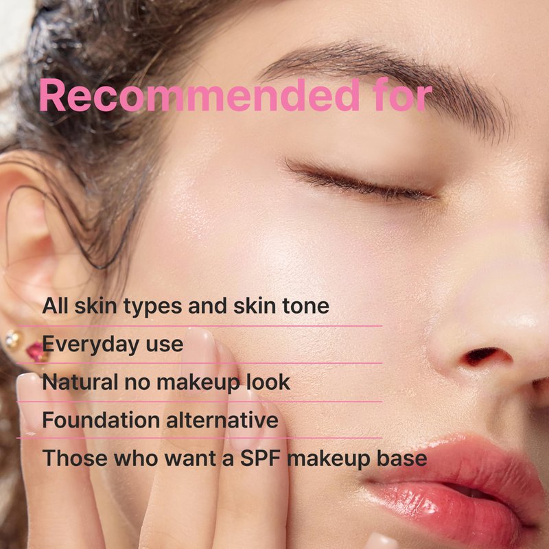 Tinted sun moisturizer that protects skin from UV rays and evens out skin tone with a natural blooming finish. 1. Natural tone-up sunscreen - Naturally evens out skin tone - sheer coverage 2. Hybrid filter - Good mix of mineral and chemical filter sunscreen - Mild and tone-up features of mineral - Light texture and dewy, moisturizing finish of chemical 3. 1+2 functional sunscreen. - Sun protection SPF50+PA++++ - brightening - niacinamide - anti-wrinkle function - adenosine 4. Lightweight texture with natural blooming finish 5. Vegan and reef-safe 6. Mild formula, dermatologically tested