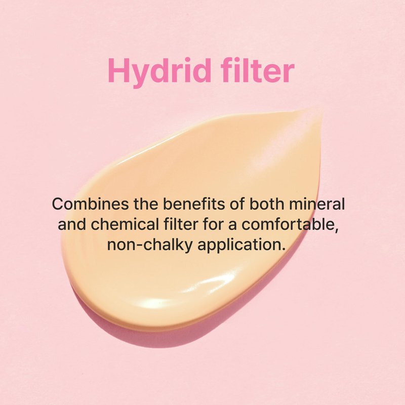 - Hybrid filter - Good mix of mineral and chemical filter sunscreen - Mild and tone-up features of mineral - Light texture and dewy, moisturizing finish of chemical
