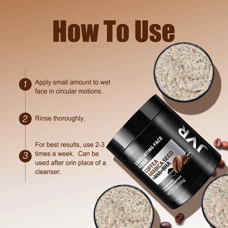 - Natural Coffea Scrub: The Exfoliating Facial Scrub helps unclog pores to deeply clean pores, soften skin, exfoliate dead skin, removes excess oil while helping skin reduce blackheads, acne and dark spots, even out skin tone.