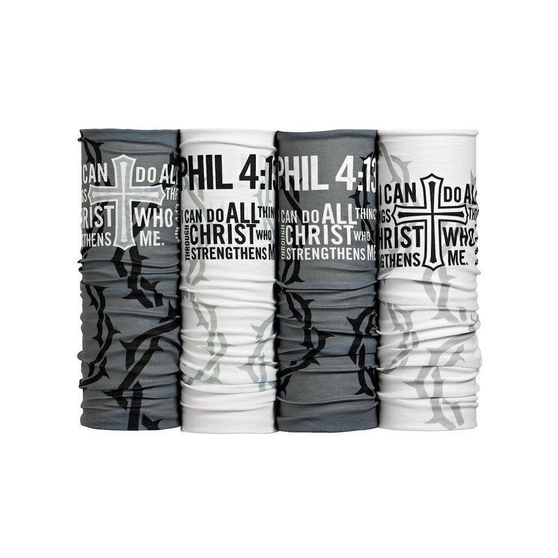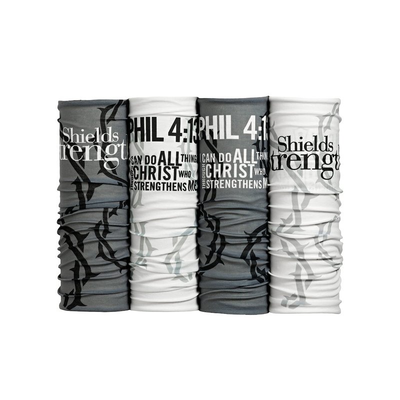 Wearing Christian gear is one of the easiest ways that men and women can stay constantly reminded of God's word. These new micro fiber face shields (pack of 4) are the perfect daily reminder. The first one has a cross on it and is heather grey with black thorns and the scripture in white of Philippians 4:13, "I can do all things through Christ who strengthens me,". The second one has a cross on it as well and is white with grey thorns and the scripture in black of Philippians 4:13. The third one has the Shields of Strength weight plates on it. Its heather grey with black thorns and the scripture in white of Philippians 4:13. The last one has the weight plates as well. The face shield is white with grey thorns and the scripture of Philippians 4:13 in black. This verse from Philippians reminds us that God is always with us, even in adversity. These are perfect for sports, fishing, motorcycle riding, etc.