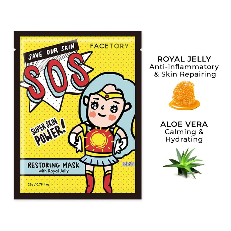 FACETORY SOS Restoring Sheet Mask with Royal Jelly - Soft Sheet Mask, For Oily, Combo, Dry, and Acne-prone skin - Soothing, Calming, Moisturizing Face Mask (Pack of 10)