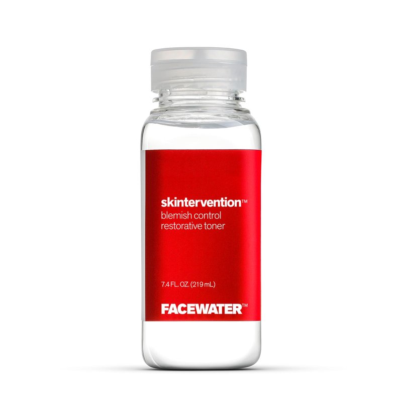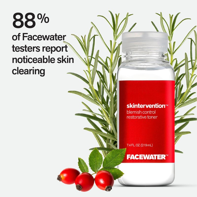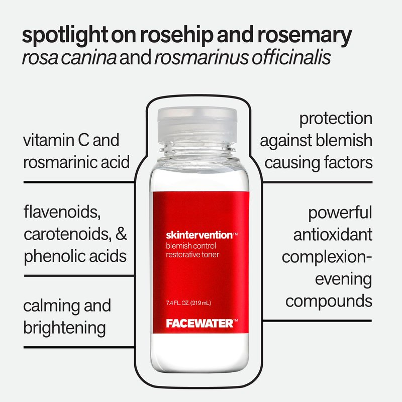 Facewater toners are super pore-healthy antioxidant rich elixirs that effectively cleanse, balance, clarify, and purify - without over drying your skin. Our moisture replenishing, 100% plant based toners are completely free of harmful synthetic ingredients. Skintervention is a fast-acting, intense - yet skin calming formula for stubborn spots, breakouts, and rough texture. This restorative toner treatment is made with distilled rosehip, which contains abundant levels of vitamins C, E and B to strengthen and support your skin barrier. Rosemary packed with rosmarinic acid clears breakout-causing buildup trapped within your pores.