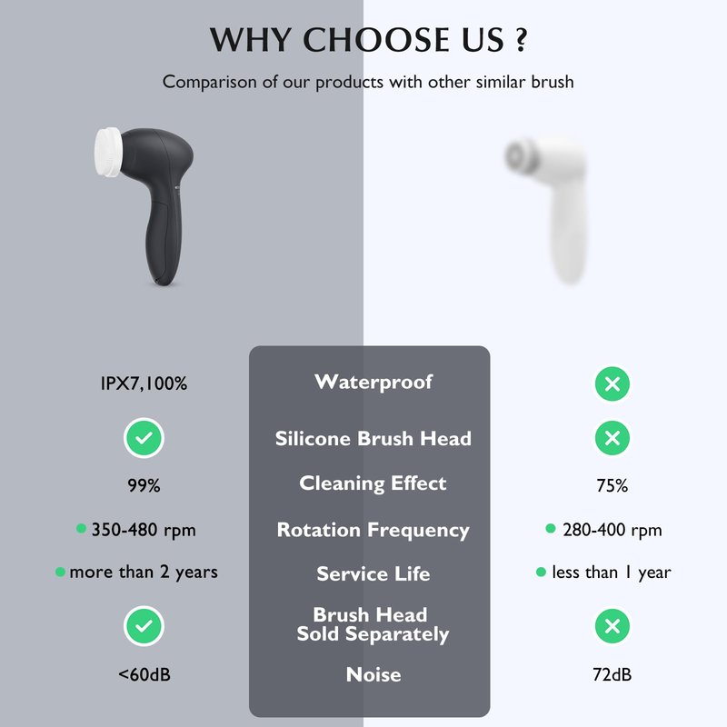 - 100% WATERPROOF AND SAFE DURING SHOWER: This facial exfoliating brush is IPX7 waterproof, making it safe to use in the shower. For the facial cleansing brush to last, we sincerely recommend that you keep the battery compartment dry and do not submerge the entire facial brush in water (Does not include 2 AA batteries)