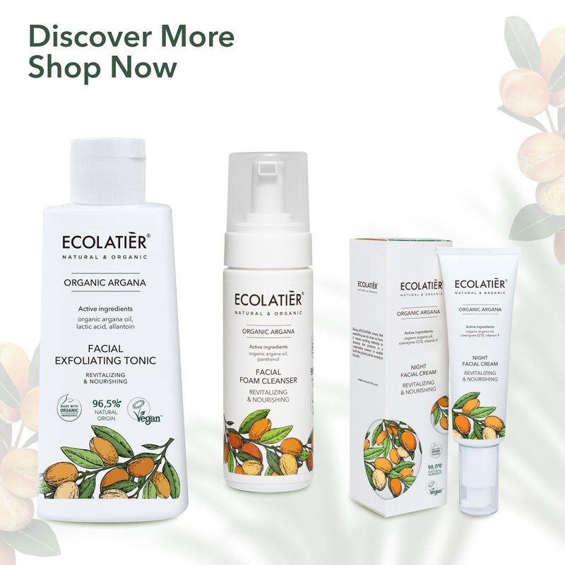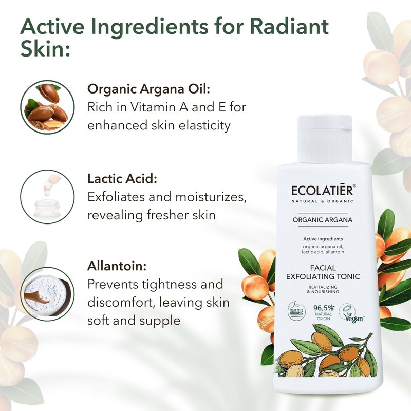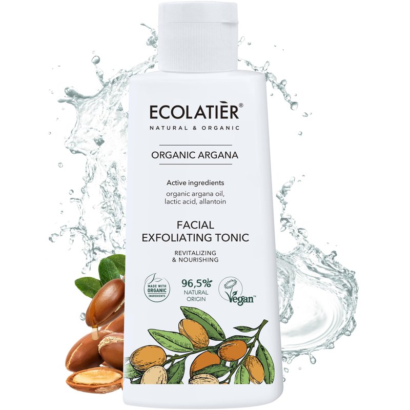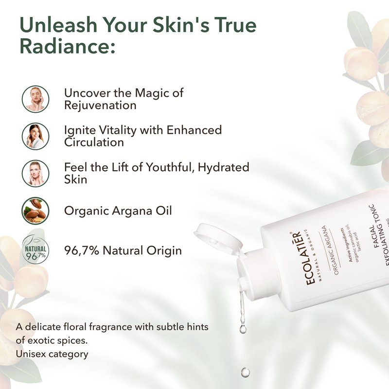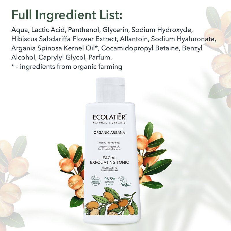 - Exfoliating facial toner with Organic Argana Oil, rich in vitamins A and E, omega-6, and antioxidants, promoting elasticity and reducing fine lines for smooth, hydrated skin.