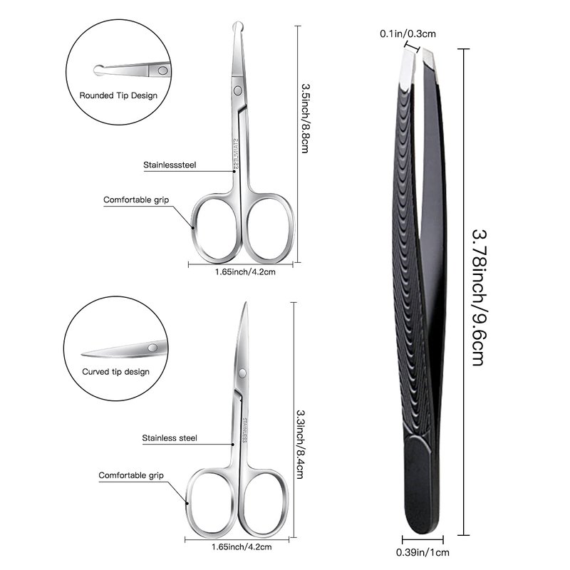 - 【Nose Hair Tweezers Scissors Set】: Our package includes a pair of nose hair scissors and 1 piece slant tip eyebrow tweezer. This small scissors can prevent you from accidentally poking and hurting your sensitive nostrils or skin, very suitable for nasal and ear hair cutting or children's hair trimming. And the eyebrow scissors are perfect for trimming beard, mustache, eyelashes, shaping eyebrows, brows and cutting nails and foot nails.