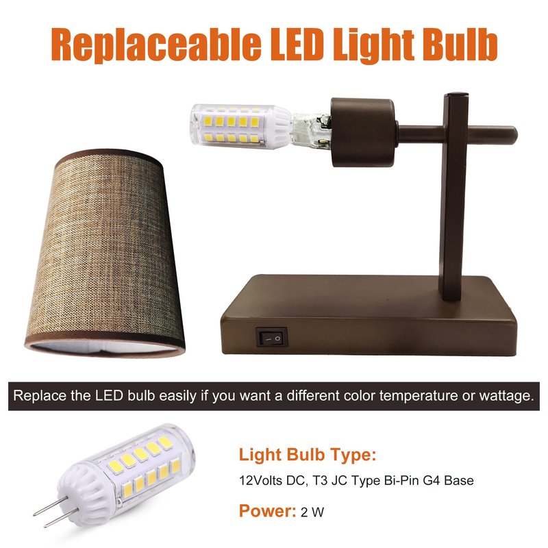 - 【Build-in On&Off Switch】 The lights comes with a replaceable LED bulbs that only provide 2W power to save your vehicle battery power. CCT for the light bulb is 3500K warm white light, when emitting from fabric shade, it is comfortable soft light. Build-in on&off switch to control the light fixture easily, no extra switch is needed.