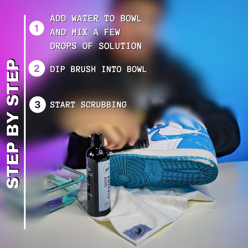 - EASY 3-STEP DIRECTIONS: Fill a bowl with water and add a few drops of our shoe cleaner solution. Dip Brush and get to scrubbing. Pat dry with the microfiber towel and let the shoes air dry.