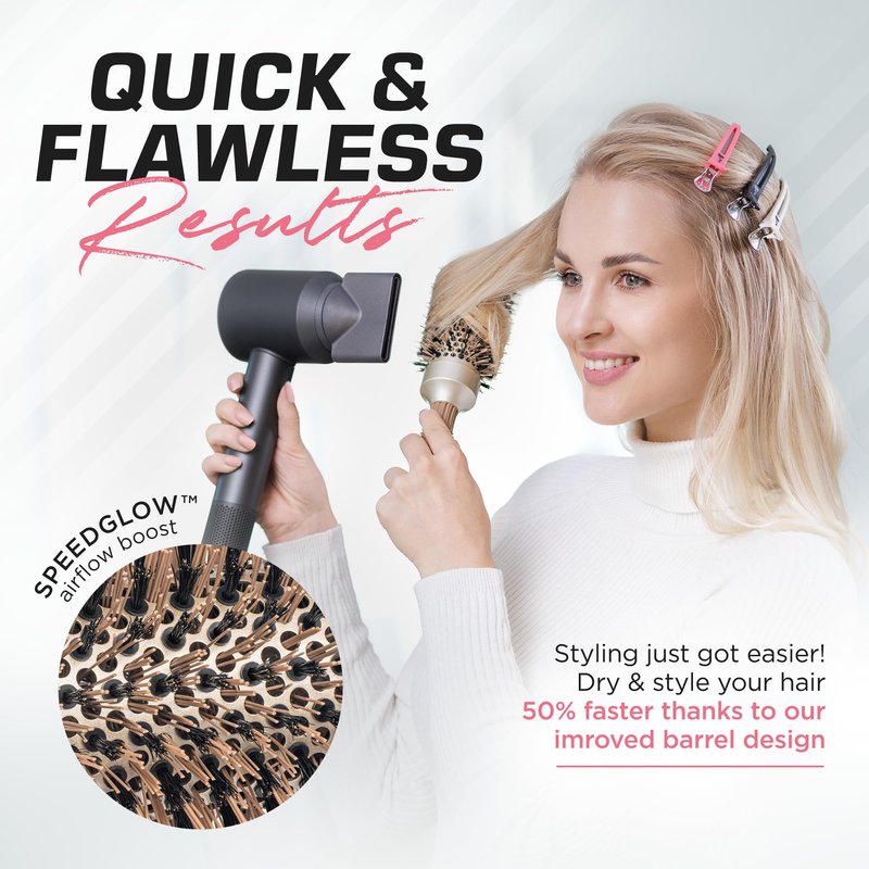 - Healthy hair & Fast styling - Due to the wild boar bristles, this round brush for blow drying is able to spread the sebum produced by the scalp from the tips until the roots of the hair, offering total hair protection to high temperatures, which will make the hair 100% healthy and silky. The tube’s orifices generate a constant and strong air flow during styling, and the hair dries fast, maintaining the hairstyle for a long time.