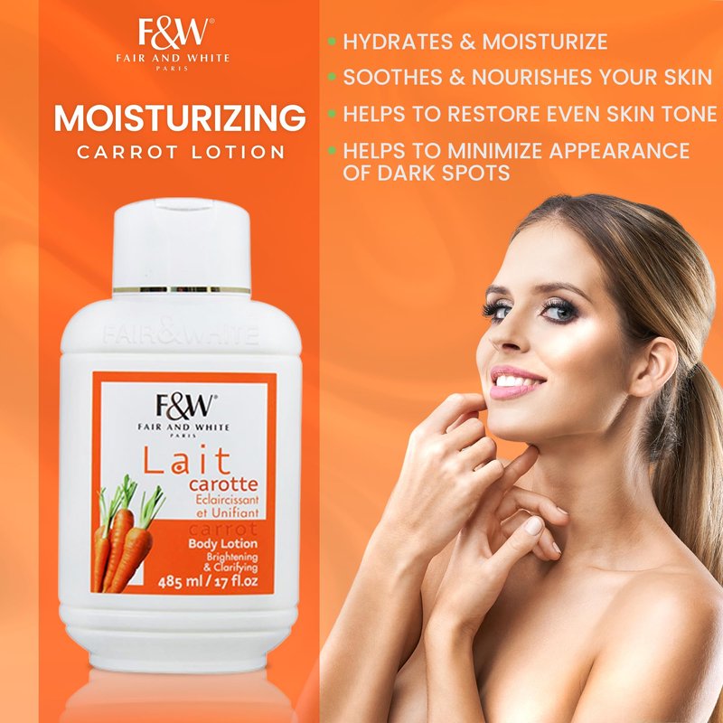 - BRIGHTENING FORMULA: With its mild, sweet fragrance, Fair & White Carrot Body Lotion, containing an active brightening ingredient combined with Carrot oil, clarifies to even out the complexion whilst nourishing the body. Naturally rich in Vitamin A, Carrot oil offers nourishing, toning and antioxidant properties to help your skin regain its radiant, soft and clear look