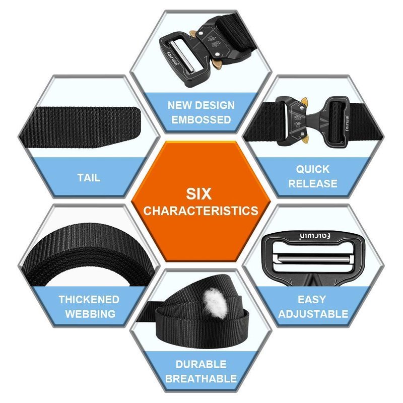 - Fairwin New Design Tactical Belt: It's not just a heavy duty quick release buckle belt, it’s fashion and durable , the embossed designed metal buckle will makes the tactical belt very fashionable in all the tactical belts. You will be impressed by the tactical belt buckle.
