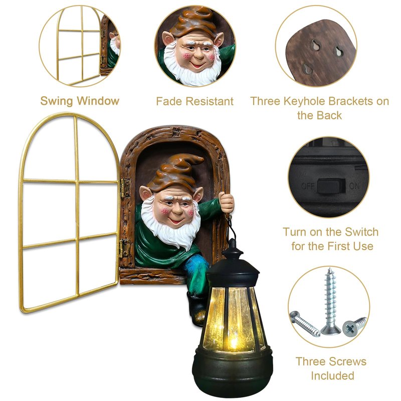 - 【Easily Assemble Whimsical Tree Decor】 - This tree faces decor outdoor is depicted as if the curious little old man with white beards is climbing out of a window to see something interesting, holding a small shining solar lantern. You can hang this gnome garden decor on your favorite tree, wall or fence with 3 keyhole brackets on the back and 3 screws provided to ensure it stay securely in place. The swinging window and soft lighting effect bring you a visual appeal and realism.
